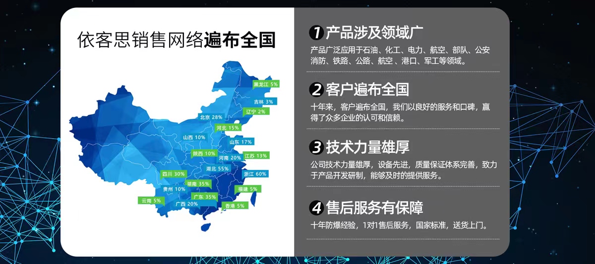 依客思防爆專注于防爆產(chǎn)品的研發(fā)、生產(chǎn)與銷售,主要產(chǎn)品有:防爆操作柱、BXCQ防爆靜電釋放儀、BZC系列防爆操作柱、不銹鋼現(xiàn)場(chǎng)操作箱、BXM(D)防爆照明(動(dòng)力)配電箱、BXX防爆檢修箱、BXJ防爆接線箱、LED防爆燈、防爆管件、防爆風(fēng)機(jī)等產(chǎn)品,型號(hào)規(guī)格齊全,廣泛適用于煤炭、電力、醫(yī)藥、石油、化工、航空等領(lǐng)域。我公司產(chǎn)品質(zhì)量過硬,價(jià)格實(shí)惠,銷售范圍廣,且與各大型企業(yè)建立了良好的合作關(guān)系,同時(shí)還遠(yuǎn)銷中、東亞和北美等地區(qū),深受用戶喜愛與青睞。